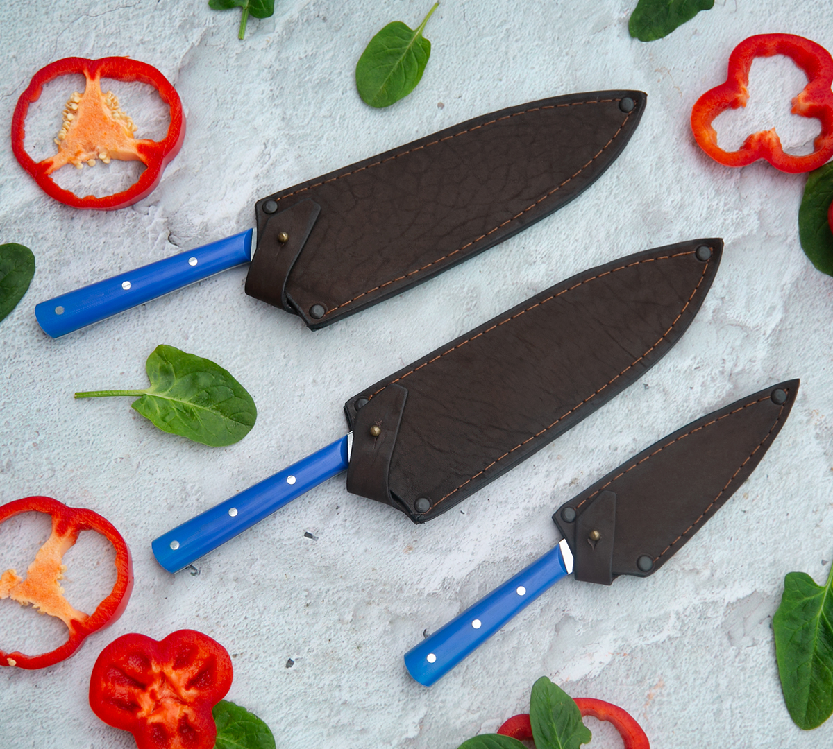 Набор Кухонных ножей из нержавеющей стали AUS-8, рукоять - G10. Кожаные чехлы в комплекте.