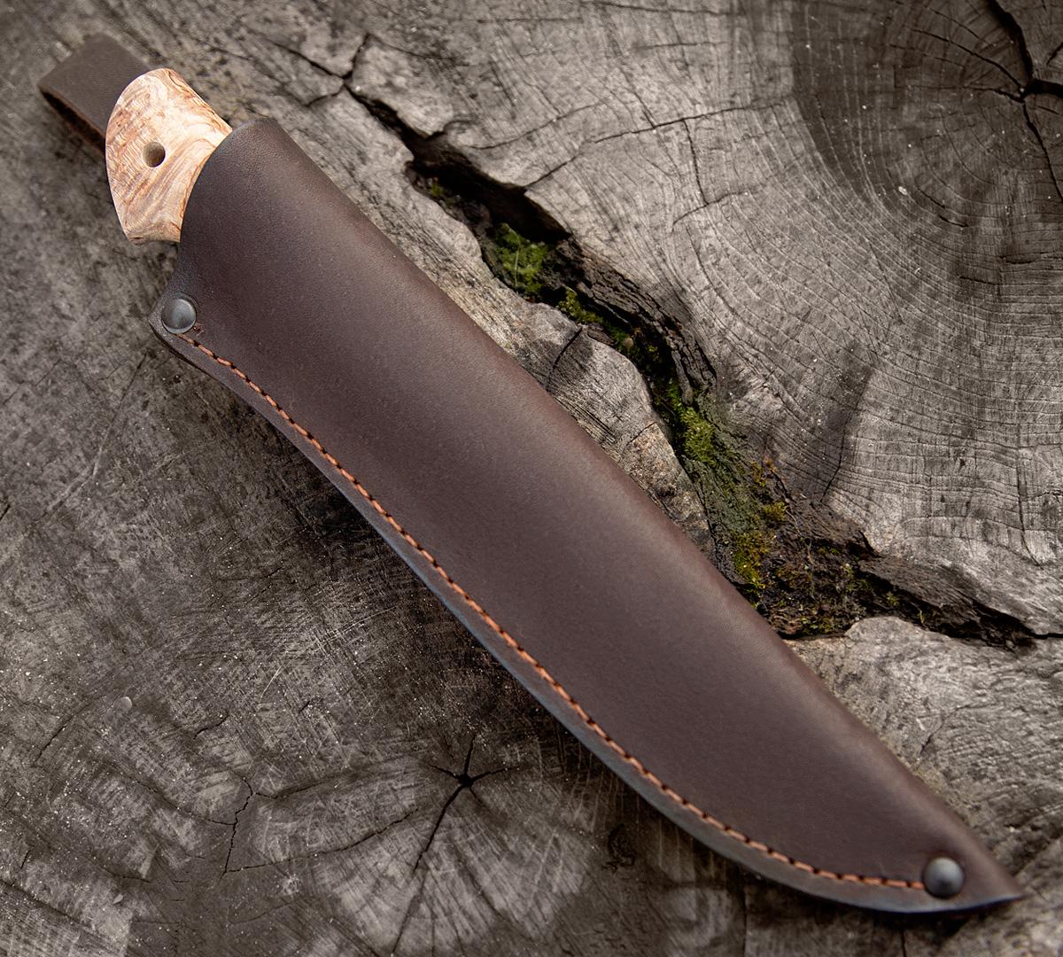 Нож Белка из булатной стали, рукоять - стабилизированный кап клена, кожаный чехол идет в комплекте.