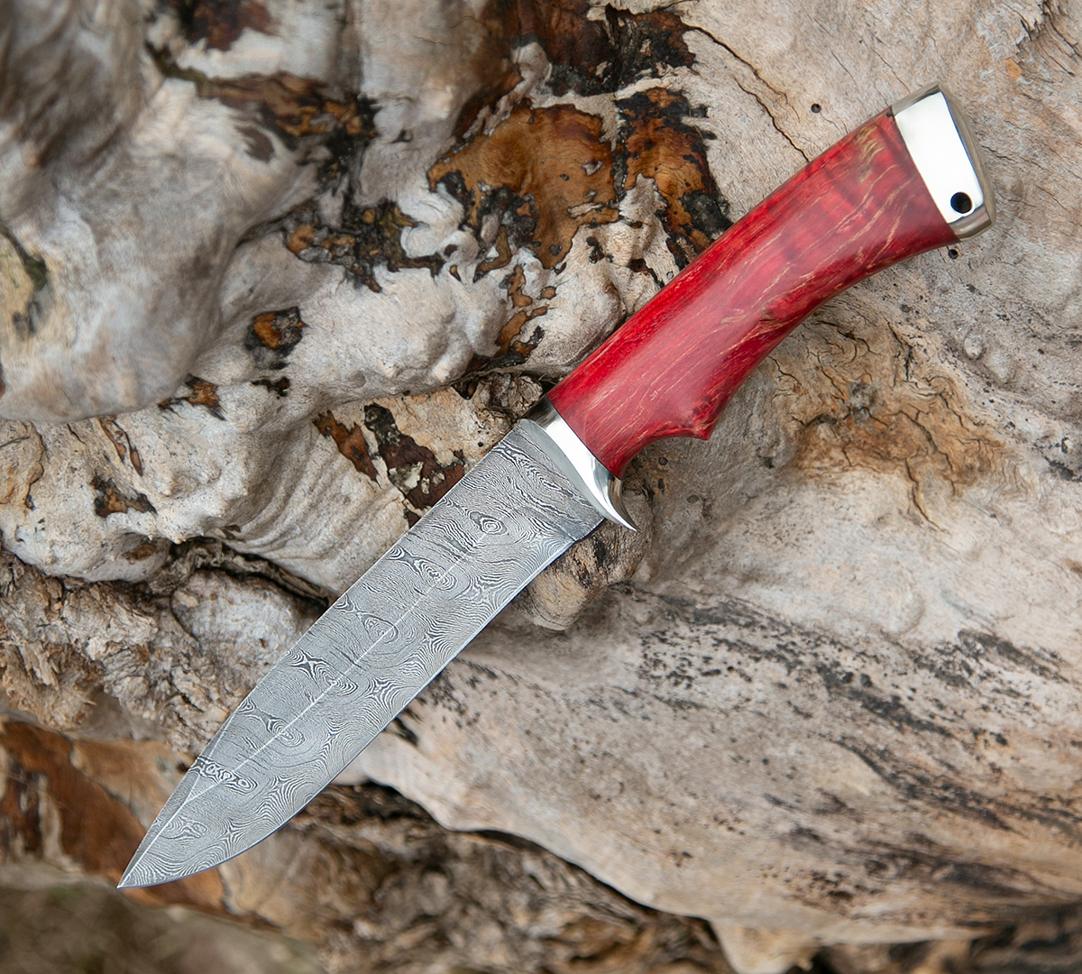 Нож Олимп из дамасской стали, рукоять - стабилизированная карельская береза, кожаный чехол в комплекте.