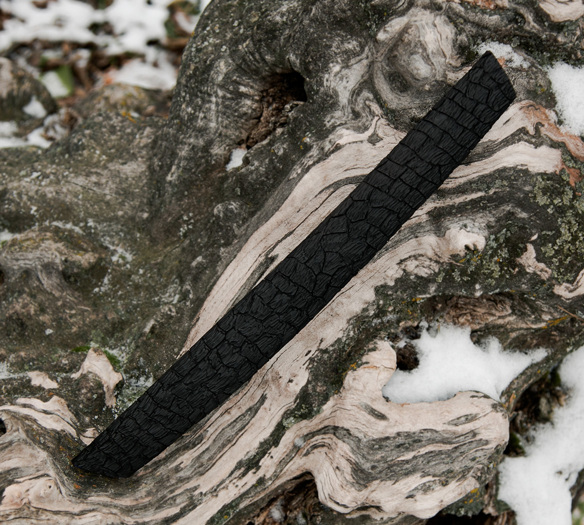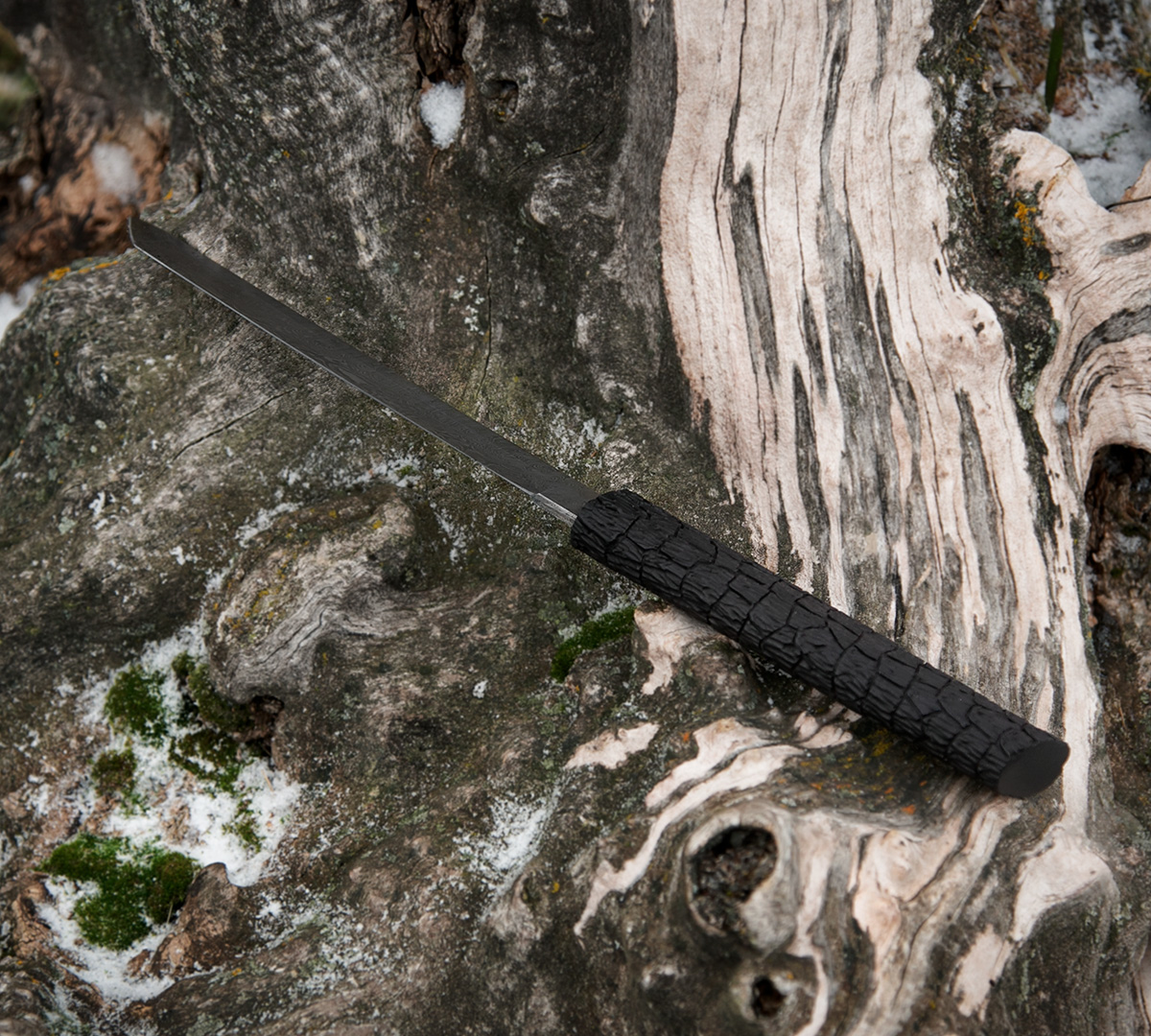 Нож Танто из дамасской стали в деревянных ножнах, рукоять и ножны - резной чёрный граб.