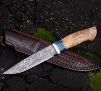 Нож Сибиряк из ламинированной стали, рукоять - стабилизированный кап клёна, вставка - позвоночник кита, формованный чехол идет в комплекте.