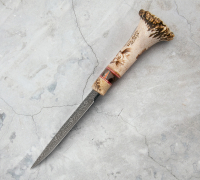Нож Сибиряк из мозаичной дамасской стали, рукоять - лосинный рог (ручное выжигание), зуб мамонта. Кожаный чехол с переплетом идет в комплекте.