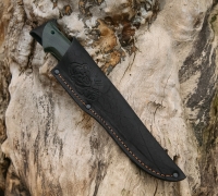 Нож Гефест из порошковой нержавеющей стали М-398 с травлением, рукоять - стабилизированный дальневосточный ясень, кожаный чехол в комплекте.