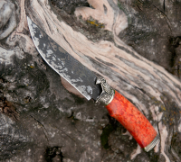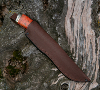 Нож Клыч из кованной стали Х12МФ с травлением, рукоять - стабилизированная карельская береза, кожаный чехол идет в комплекте.
