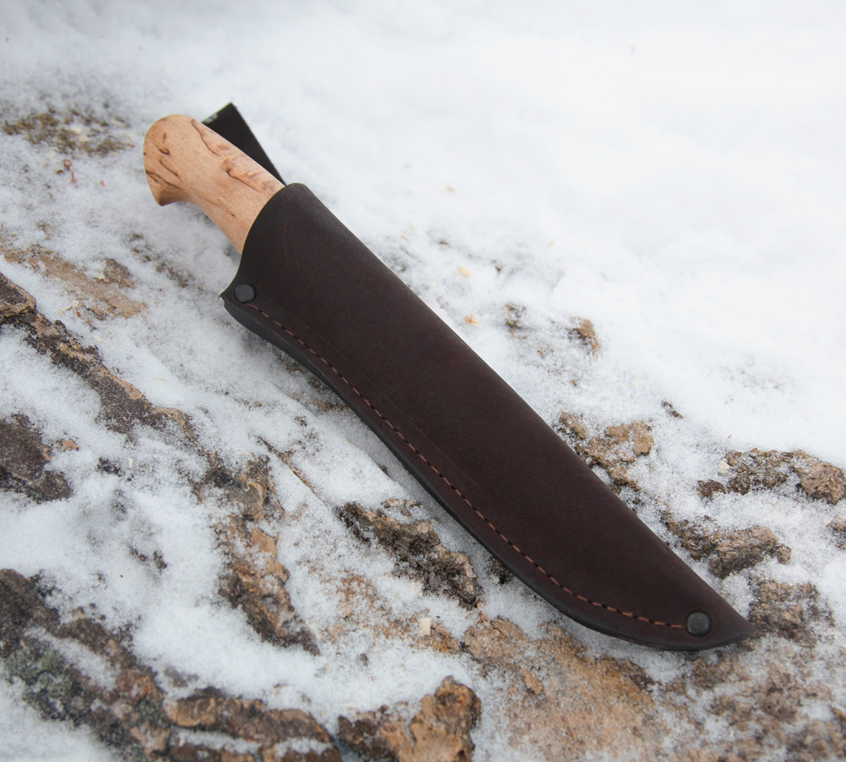 Нож Пуукко из кованной стали Х12МФ, рукоять - стабилизированная карельская береза, кожаный чехол идет в комплекте.